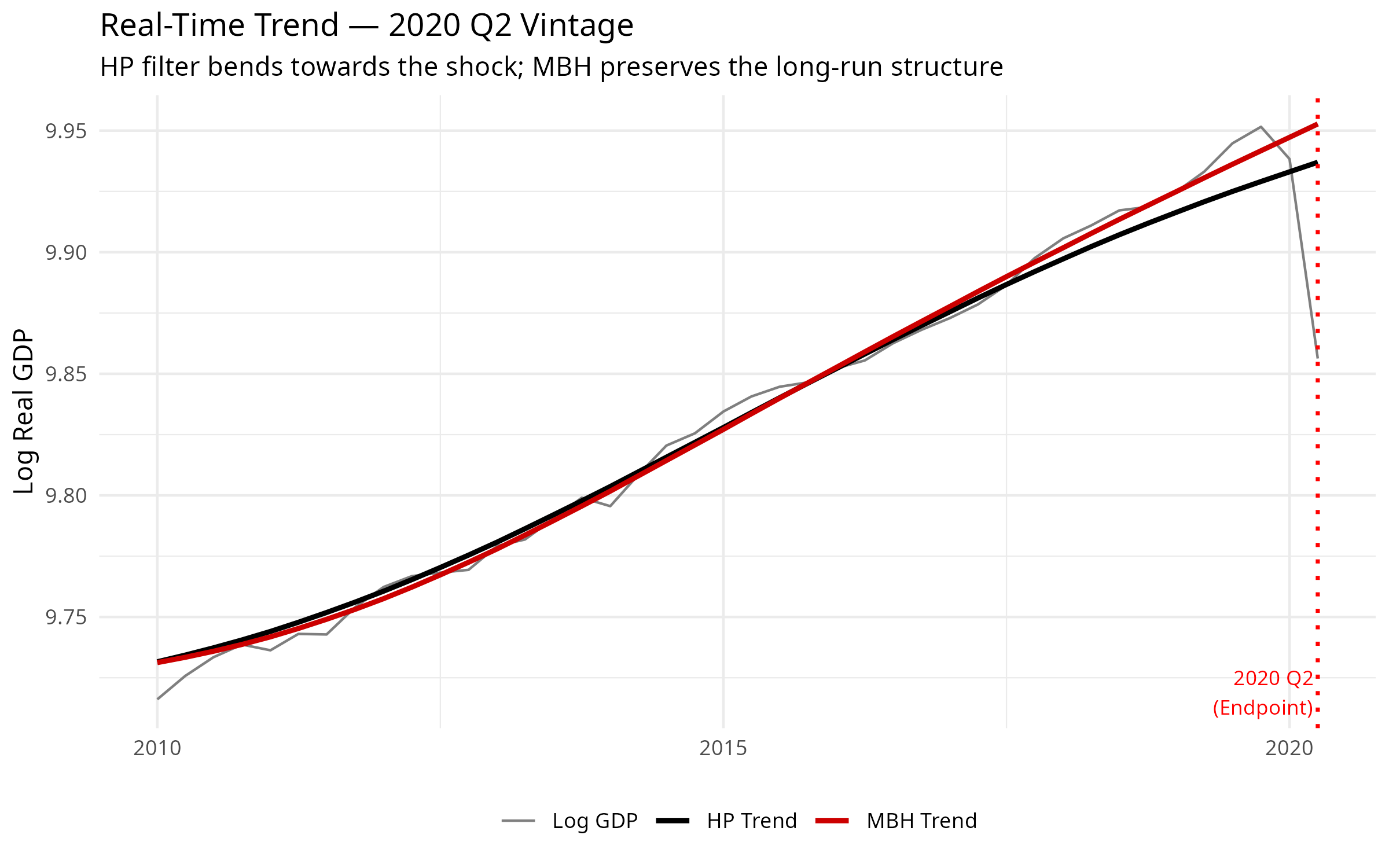 As demonstrated with Real US GDP during the 2020 Q2 COVID-19 collapse, the standard HP filter bends towards the shock. The MBH filter isolates the exogenous shock entirely within the cyclical component, preserving absolute trend integrity in real-time.