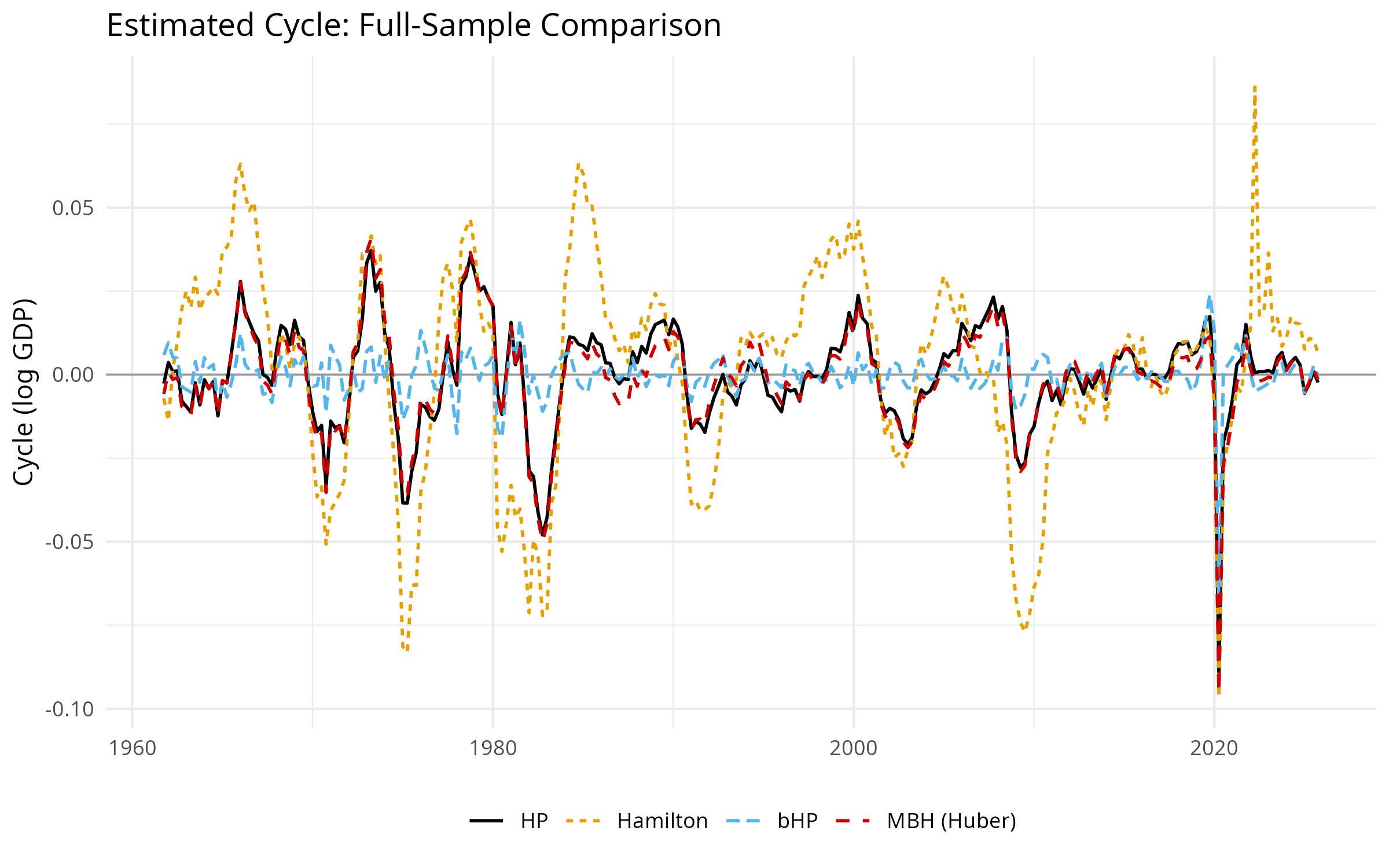 Furthermore, ex-ante spectral alignment ensures the MBH filter perfectly matches the baseline cyclical volatility of the industry-standard HP filter during normal conditions, unlike the excessively volatile Hamilton filter.